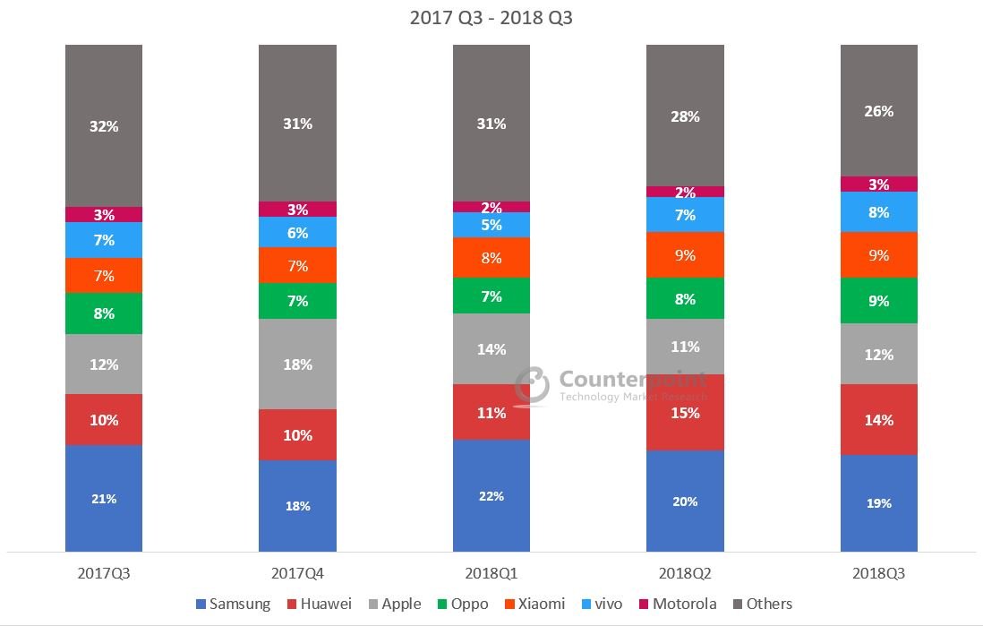 | Global Smartphone Shipments | 2017 Q3 | 2017 Q4 | 2018 Q1 | 2018 Q2 | 2018 Q3 |