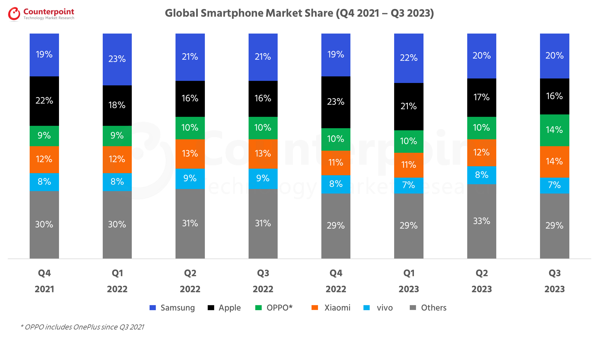 • Samsung declined 8% YoY despite growing by 11% QoQ and retaining its position as the top smartphone player in Q3 2023.
